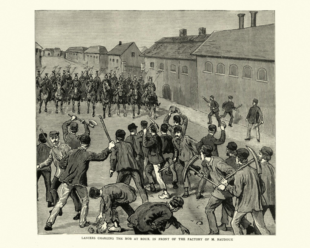 The strike escalates into riot. Machinery is destroyed; confrontation with troops turns deadly. Marxist theory views violence not as moral aberration but as symptom of irreconcilable class antagonism. When exploitation reaches unbearable intensity, conflict becomes open.
